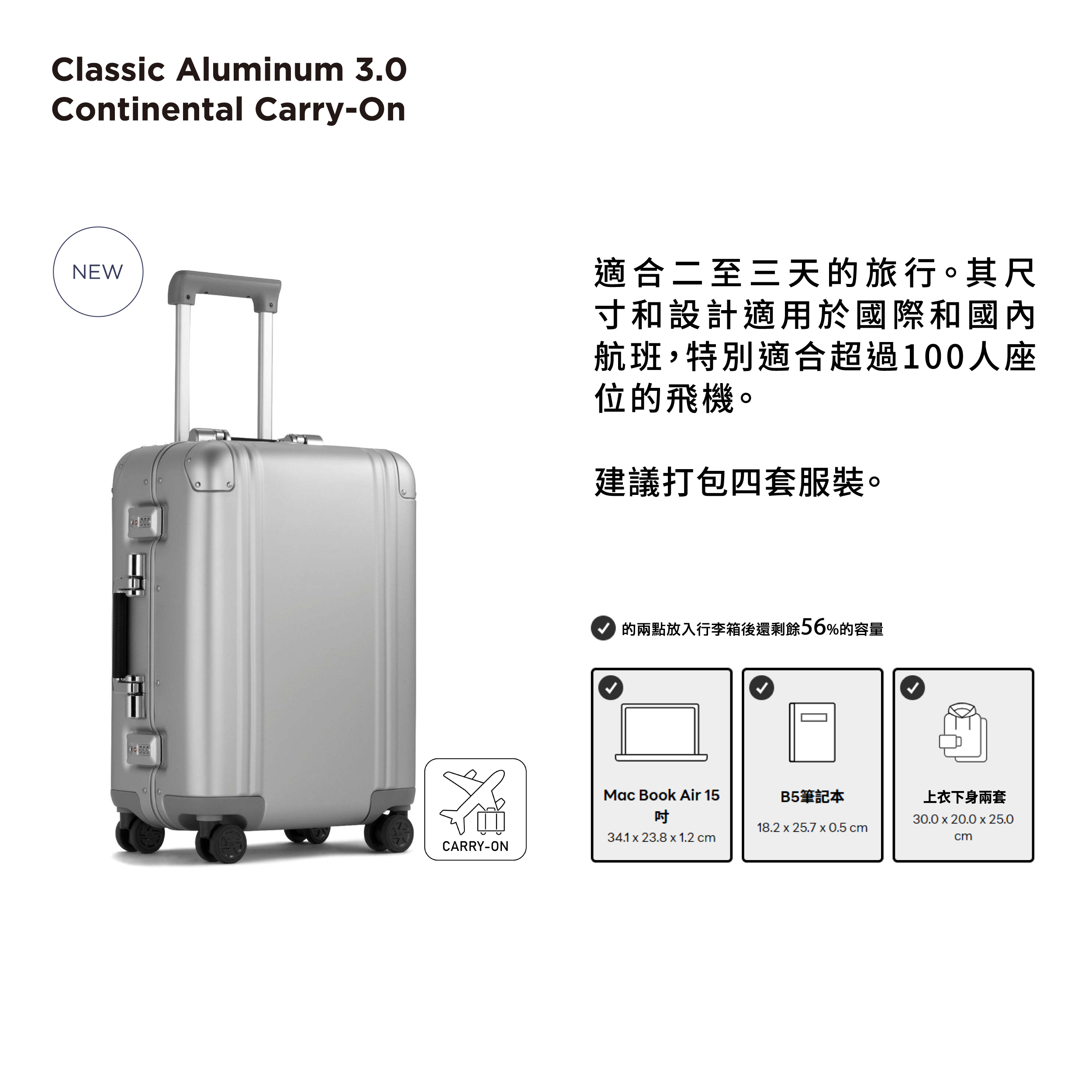 ・適合2~3天左右的的出差或旅行,可對應國際線、國內線100席以上的飛機座位配置。
