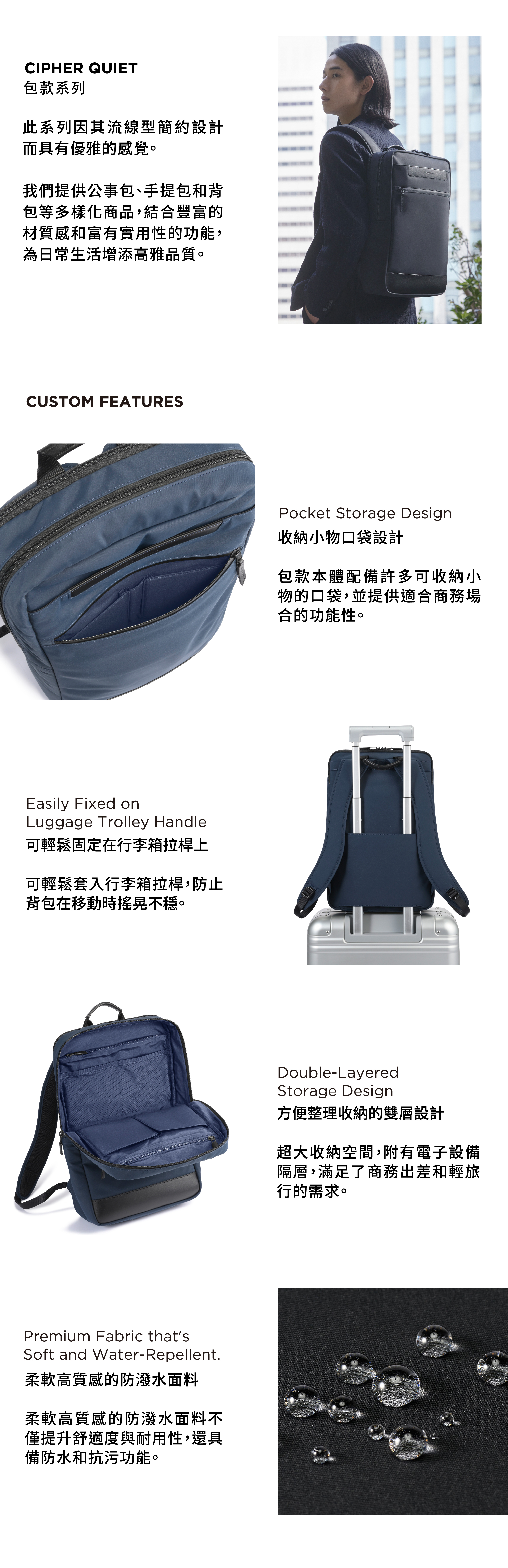 以精緻極簡的設計脫穎而出,散發高雅的氣質。主要選用柔軟優質的面料,手感部分如把手等則採用了真皮光滑處理。結合豐富的材質感和富有實用性的功能,為日常生活增添高雅品質。