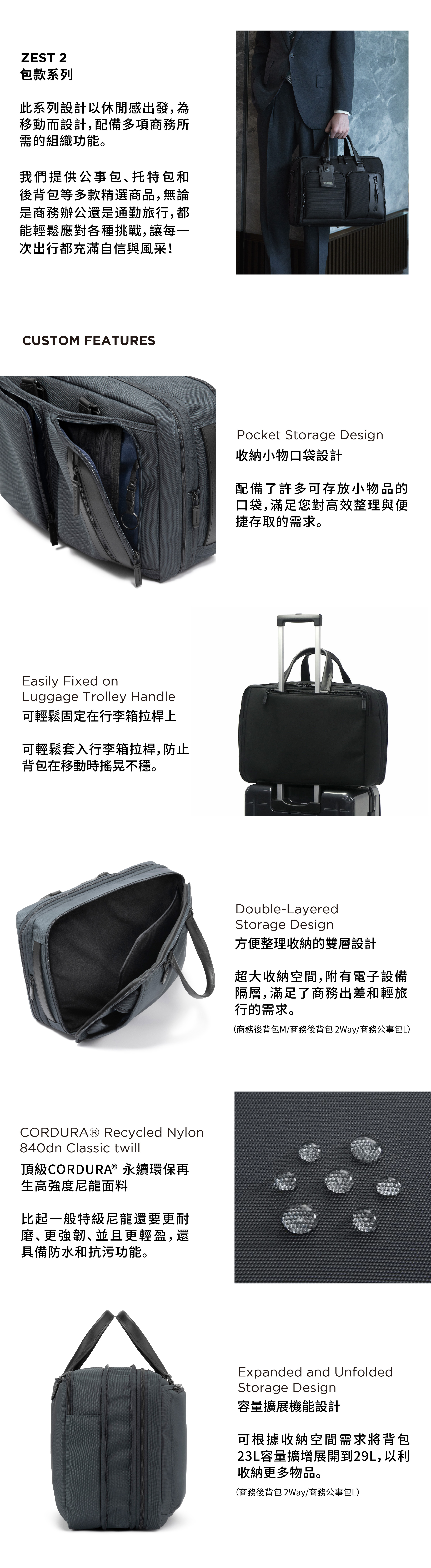 融合了休閒感的設計,配備多項商務所需的組織功能。主要採用環保再生尼龍面料,而手把等觸感部分則使用真皮處理。具備後背和手提2WAY兩種攜帶方式,匯集了忙碌生活方式所需的實用設計,輕鬆陪伴您度過每一天。